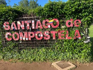 Am Stadtrand von Santiago geht es noch einmal richtig bergauf und bergab. „Santiago muss man sich verdienen“, sagt mir eine Schweizerin, die hier seit dem 3. Mai mit ihrem Vater pilgert. „Poppi“, signalisiert sie liebevoll ihrem Vater, wenn er die gelben Pfeile nicht gleich sieht. Ein Brasilianer gesellt sich zu unserer bergsteigenden Plauderrunde.