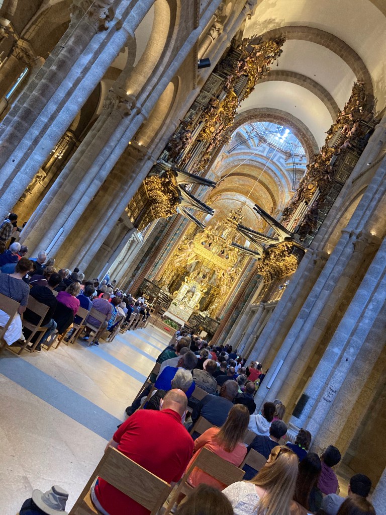 Und natürlich gehört nach einem solchen Weg auch die Pilgermesse in der Kathedrale dazu, die am Mittag stattfindet. Der Bischof von Campostela spricht. Ohrgewaltige Orgelmusik. Ein riesiger Weihrauchkessel schwenkt über den Kirchgängern. Durch die Halle schallt: „Damos la bienvenida a los peregrinos de España, damos la bienvenida a los peregrinos de las Américas, damos la bienvenida a los peregrinos de alemania….“ Weiter, weiter, wir begrüßen Pilger aus Brasilien, wir begrüßen Pilger aus England…