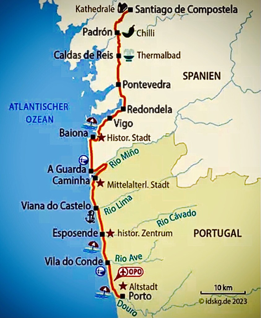 Also gehe ich jetzt einen für mich neuen Jakobsweg, den Camiono Portugués de la Costa. Den Küstenweg. Der Portugiesische Küstenweg folgt der Atlantikküste von Porto über Viana do Castelo, A Guarda und Vigo bis er in Redondela auf den zentralen Portugiesischen Weg trifft. Dieser Weg wird seit dem 16. Jahrhundert von Pilgern genutzt und erfreut sich stetig wachsender Beliebtheit. Dafür gibt es viele Gründe: wunderschöne Landschaften, eine bequeme Route ohne größere Höhenunterschiede, gute Infrastruktur, Strände, Kultur und vieles mehr; ganz zu schweigen von der Gastronomie und den unglaublichen Sonnenuntergängen über dem Meer. So steht es zumindest in den Reiseführern. Es soll der leichteste Jakobsweg sein. Sozusagen für Anfänger. Von Kirchen steht da nix.