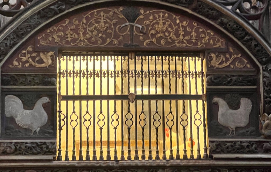 Die Kathedrale von Santo Domingo ist nicht nur groß und großartig, sondern sogar geöffnet. Hier entschließe ich nicht dann doch fünf Euro Eintrittsgeld zu investieren, vor allem wegen einer sonderbaren Geschichte. In der Kathedrale lebt in einem goldenen Käfig ein weißer Hahn mit Henne. Und das kam so: