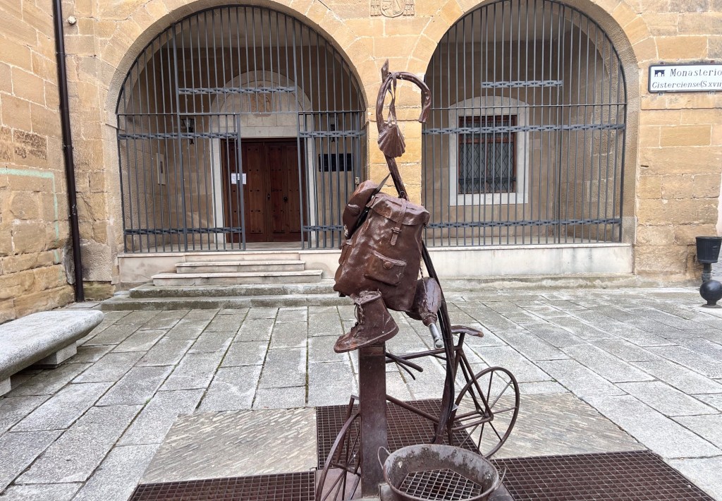 Überhaupt scheint die Obernonne des Monasterio die Pilger gerne ein wenig zum Narren zu halten. Da steht doch am festverschlossenen Eingangstor ein durchaus pilgerfreundlicher Hinweis „Klostergebäck, Wein, Mandeln, Nüsse, Quitte zum Verkauf am Eingang der Hospederia, Calle Pinnar Nr. 2“. Also stiefel ich los, an sechs Meter hohen Mauern vorbei bis zur Calle Pindar. Was ich nicht finde, ist das Klostergebäck. Die Klosterbäcker hatten wahrscheinlich gestern, am Sonntag, frei. Gut kein Gebäck. Nur Gepäck.