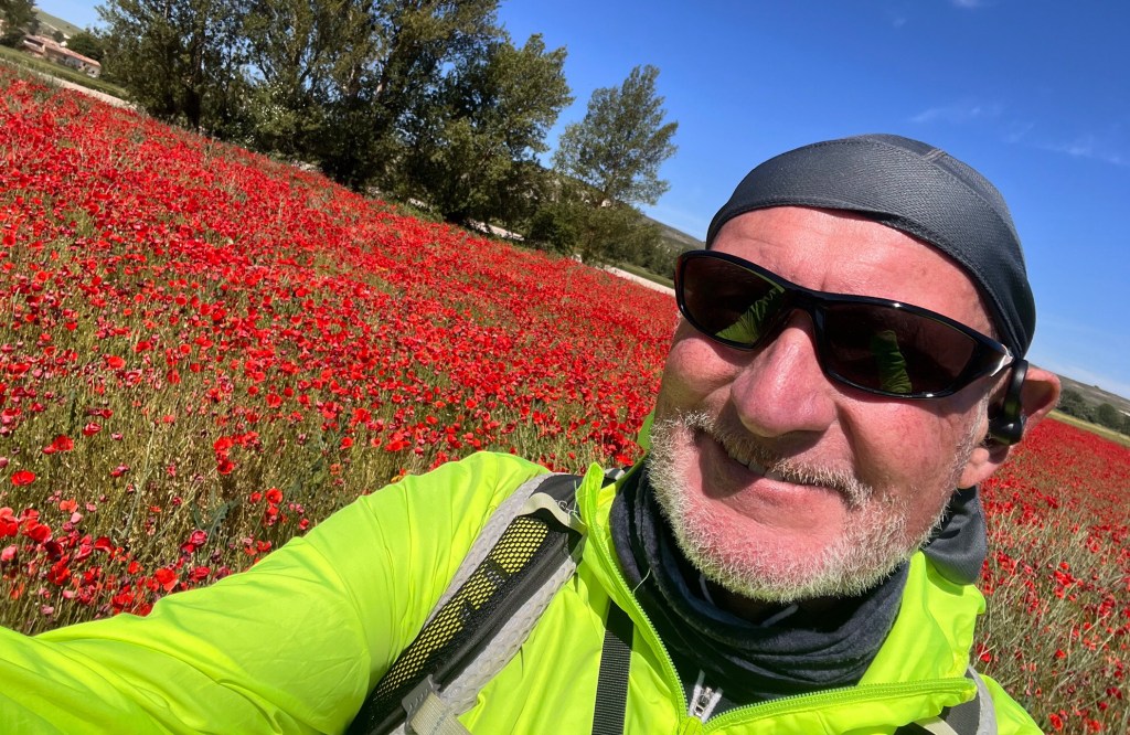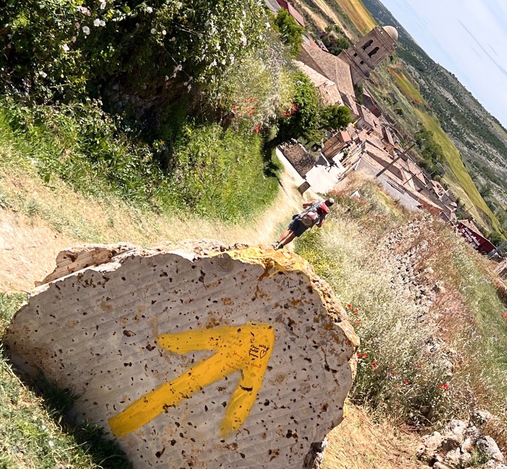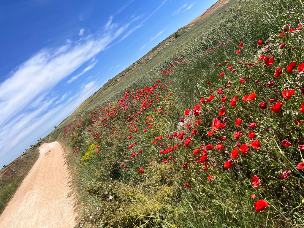Die heutige Etappe ist traumhaft schön. Nach Tardjajos und Hornillos del Camino wandere ich hinauf auf die Hochebene der Mesata und hinein in das Dorf Hontanas. Hier sollen angeblich vor 20 Jahren noch keine Autos gefahren sein, nur Pferdefuhrwerke. Das Dorf ist tatsächlich ziemlich ausgestorben. Aber der Weg dahin voller roten Mohn links und rechts. Ich höre das Lied „Roter Mohn“ von Rosita Serrano aus dem Jahr 1938, das später noch einmal durch die junge Marianne Rosenberg neu interpretiert wurde. Unbedingt anhören! Die Kirchenglocken läuten, während ich schreibe…