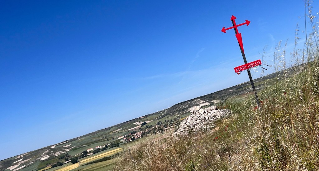 Komisch, hinter der Stadt ist wieder alles klar. Ein gelber Pfeil auf die Straße gemalt, kann ja eigentlich nicht die Welt kosten. Aber wer weiß, was gelbe Farbe in Spanien kostet. In Burgos Villalbilla sehe ich auf dem Dach eine Feldsteinkirche sogar ein Storchenpärchen. Oder sind das die ersten Geier, die auf den erschlafften Pilger harren? Doch dann kommt es. Ein Riesenautobahnkreuz. Natürlich hören hier die Jakobswegzeichen prompt auf. Wie soll man sich denn hier zurechtfinden? Vorsichtig, länglich Leitplanke entlang, die mir jetzt mein Google Maps zeigt, taste ich mich über und unter Brücken hindurch. Was hat sich Spaniens Fremdenverkehrsverband denn dabei gedacht? Konnte sich mal wieder der Tourismusminister nicht gegen den Verkehrsminister durchsetzen? Das ist ja lebensgefährlich. Und wahrscheinlich hätte man auch hier eine gute Lösung finden können, wenn schon Millionen in ein solches Kreuz gesteckt werden.