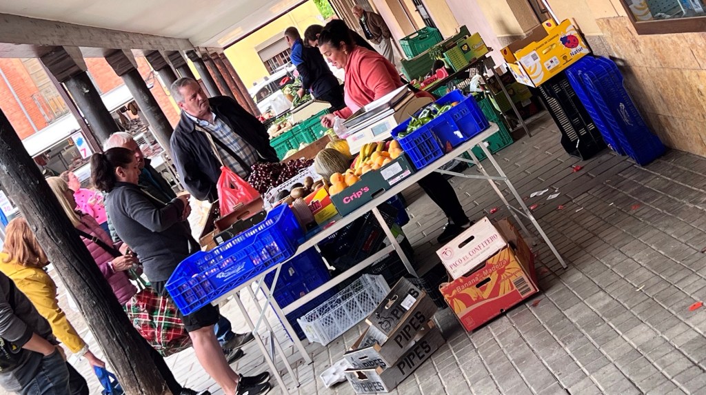 Nach 20 Kilometern kommt endlich Mansilla de las Mulas, Mansilla der Maultiere. Und hier wagt sich plötzlich die Sonne heraus. Sie wirft einen Strahl über einen kleinen Bauernmarkt mit Gemüse, Käse und Schinken aus der Region. Die Menschen sitzen rund um den Marktplatz und trinken fröhlich ein Gläschen Rotwein. Es ist Halb Zwölf. Und dann wartet da die Kirche Santa Maria. Eigentlich eine Kirche wie jede andere, ein bisschen bescheidener, eine Pilgerstatue auf einer Säule. Aber der pudelnasse Wanderer sucht nur nach Wärme und Trockenheit. Und drinnen singt die argentinische, Katholic-Pop Sängerin Athenas „Contigo Maria“. Da bleibst du stehen und hörst zu. Ganz schön kitschig.
