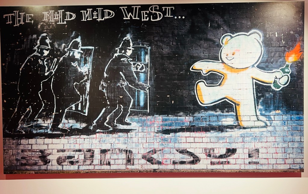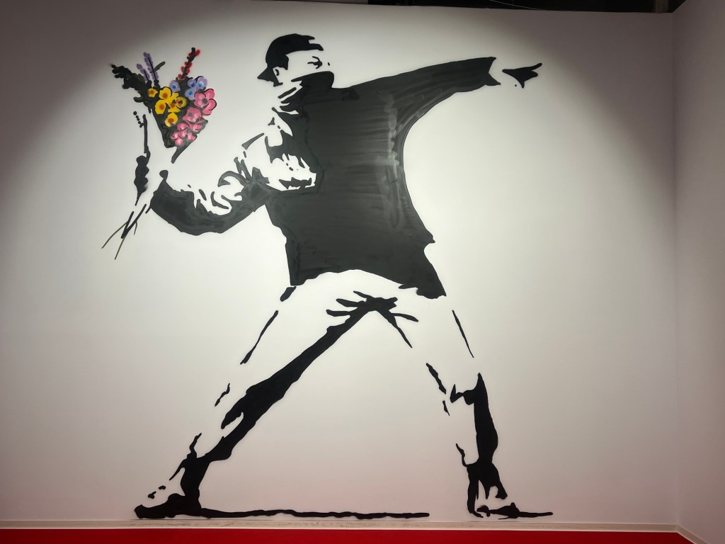 Seine Antikriegsstatements, sein Steinewerfer, der mit Blumen droht, oder auch das Hotelzimmer in Bethlehem mit Blick auf die illegal errichtete Sperranlage, die das Westjordanland von Israel abtrennt – Banksys Bildkommentare zum Weltgeschehen sind höchst aktuell und politisch brisant. Das „Walled off Hotel“ in Bethlehem ist ein Boutique-Hotel, das mit „der schlechtesten Aussicht der Welt“ wirbt. Es gilt – gemeinsam mit anderen Kreativen entworfen – als Banksy Kommentar zum israelisch-palestinensischen Konflikt. Im aktuellen vom Hamas-Terror provozierten Krieg hat es an Aktualität nichts verloren, eher gewonnen. 2017 gegründet zog das Walled off Hotel bislang 140.000 Besucher an.