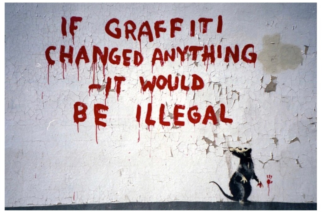 Eines von Banksys Werken, das 2011 in Fitzrovia, London, auftauchte. Es zeigt eine Ratte mit roter Farbe auf der Pfote, darüber einen Schriftzug: „Wenn Graffiti etwas ändern könnte, wäre es illegal“. Banksy scheint sich hier auf eine Zitat von Emmy Goldman zu beziehen: „Wenn Wahlen etwas ändern könnten, wären sie illegal.“ Die Frauenrechtlerin setzte sich für das Wahlrecht für Frauen ein.