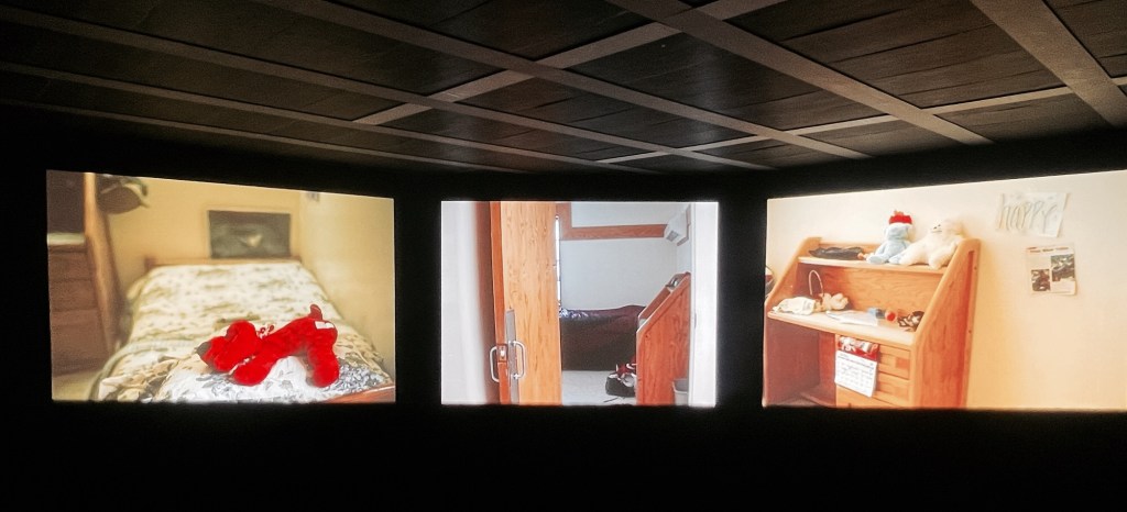 Im nächsten Bilderbungalow „Sisters, Saint, and Sibyls“ widmet sich Goldin mit einer Dreikanal-Videoinstallation von 2004 bis 2022 ihrer älteren Schwester Barbara Holly Goldin. Barbara, die als Teenager mehrfach in die Psychatrie eingewiesen wurde, nahm sich mit 18 Jahren das Leben. Der Film beginnt als Mythos der gleichnamigen Figur, der heiligen Barbara. Über berührende Familienbilder endet die 35-minütige Show mit Off-Kommentaren schließlich in Fotos der Sucht, der Einsamkeit in anonymen Klinikbetten und der Selbstverletzungen mit Blutschlieren an grünlackierten Klinikwänden. Der Ausstellungsprospekt beschreibt die Installation als „Ode an das Leben“. Dem Autor gefriert das Herz. Er sieht die Einsamkeit eines alleingelassenen Kindes. Da stockt einem der Atem.