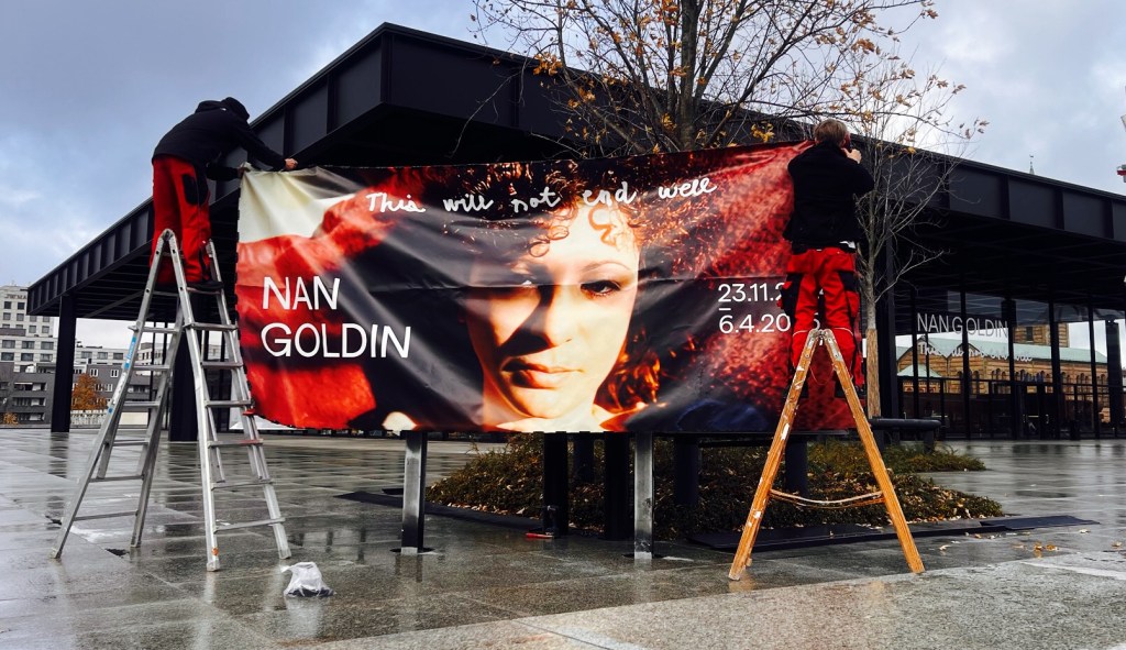 „This Will Not End Well“ – das wird nicht gut ausgehen, heißt die Schau in Berlin. Und womöglich ist der Name Programm. Der Schriftzug ist schon von weitem zu sehen: „This Will Not End Well“ steht in hellen, geschwungenen Buchstaben über dem Eingang der Neuen Nationalgalerie. Ursprünglich stammt der Satz aus einem Streit, den Nan Goldin mit einem Freund hatte. Nun ist die düstere Prophezeiung auch Titel der großen Retrospektive der US-Künstlerin, die nach Stationen in Stockholm und Amsterdam auch in der deutschen Hauptstadt zu sehen ist – einem einst wichtigen Ort im Schaffen der heute 71-Jährigen.