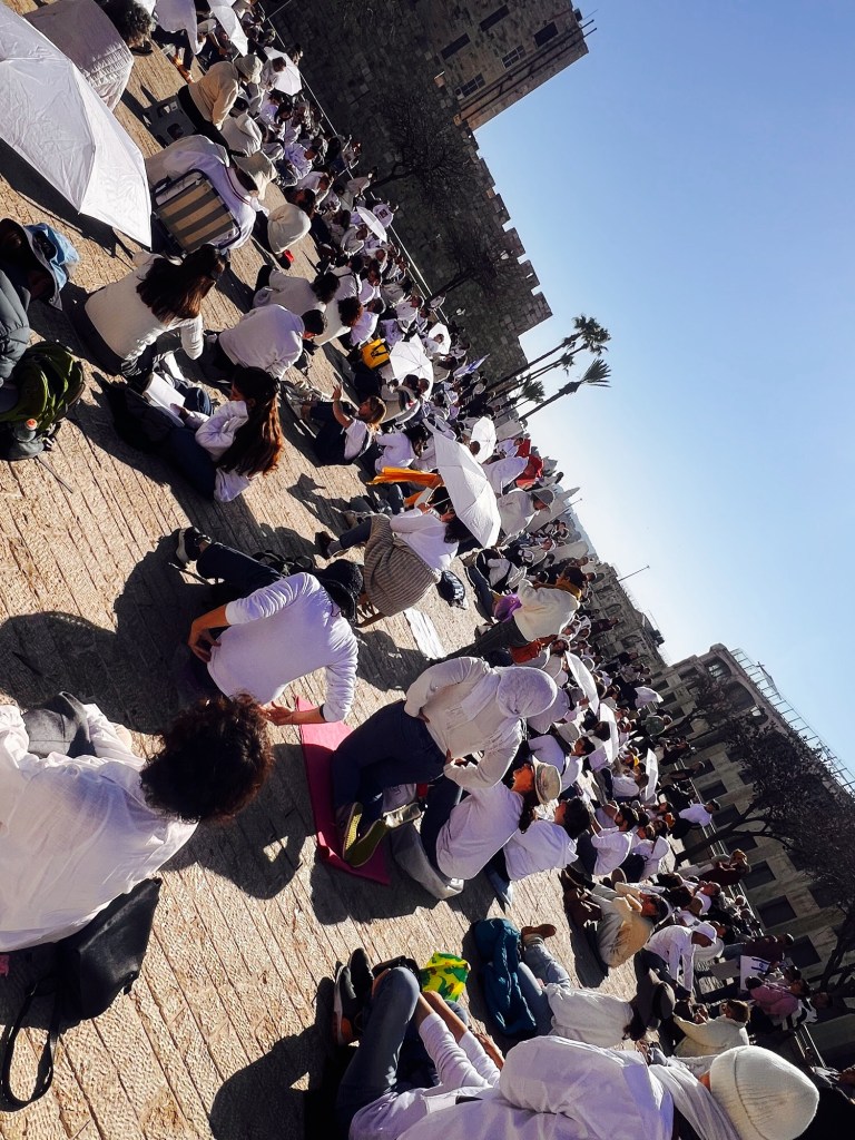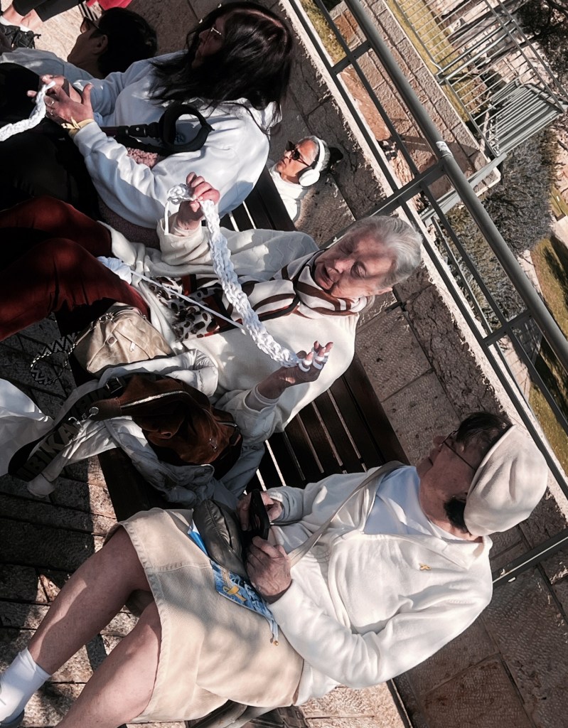 Im großen Kreis vor dem „I love Jerusalem“-Symbol mit Blick auf das Jaffa-Tor zur Altstadt sitzen sie schweigend. Die Frauen, die Weiß tragen. Mit weißen Kopftüchern. Sie blockieren den Platz, von dem aus sonst die Erinnerungsfotos der Jerusalem-Touristen entstehen. Am Rande ältere Frauen, die an einem weißen langen Schals stricken, angeblich seit Kriegsbeginn. „Stricken für den Frieden“. Überall wird in den großen Städten Israels inzwischen gestrickt. Im Café, in der U-Bahn, auch gelegentlich auf dem Platz vor der Hurva Synagoge.