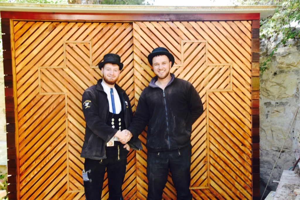 Sie bleiben und bauen den Mönchen in der Dormitio Abtei im Garten einen schönen Verschlag für irgendwelche hässlichen Stromkästen. Sogar ein Kreuz haben sie hineingewerkelt. Worauf sie stolz sind. Und offenbar sind die Mönche höchst zufrieden, zumal das Material auch irgendwie von heimischen Handwerkern liegengeblieben war.