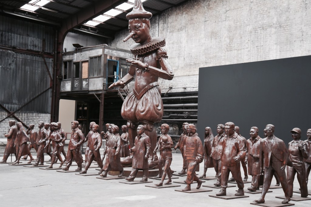 Der überlebensgroße, wohl gut sechs Meter hohe Pinocchio wurde in diesem Jahr in die Halle geholt. 2022 war die Installation des chinesischen Künstlers LIU Ruowang auf der Carlshütte in Büdelsdorf der Hingucker auf der NordArt. Das kann man dem Kunstwerk guten Gewissens nachsagen, ohne die anderen 200 Künstler zu beleidigen, deren Malereien, Installationen, Fotografien, Skulpturen jedes für sich ebenfalls einzigartig sind. Aber LIU Ruowangs Figurenspiel überragt nicht nur viele andere Werke, sondern war bereits damals hochpolitisch – weil umgeben von einer 36-köpfigen Schar von Passanten, gleichsam der chinesischen Terrakotta-Armee. Den Pinocchio in der Mitte umkreisten ewig ahnungslose Zeitgenossen, die seine Lügen ungerührt oder achtlos, teils auch interessiert aber kritiklos hinnahmen.