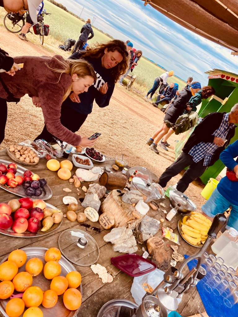 Unterwegs bauen immer wieder Pilger-Helfer kleine Stände auf, bei denen man gegen zwei oder drei Euro-Spenden Kaffee, Bananen oder Käse und Brot bekommt.