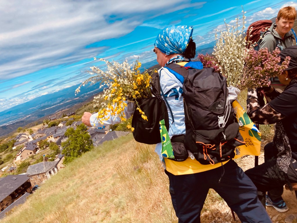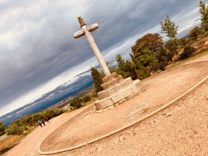 So nun stehe ich oben. Am Cruz de Ferro. Kleiner als gedacht. Aber ich bin flott unterwegs, hab den Aufstieg auf 1500 Meter über Rabanal in dreieinhalb Stunden geschafft. Jetzt müsste ich doch Gott am nächsten sein. Aber nichts zu sehen. Nicht mal ein Zipfelchen Gott. Dafür eine unendliche weite, schöne Berglandschaft, ein Panorama. Wie wunderbar.