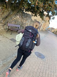 Also nicht lange sinniert, die nassen Strümpfe von der Wäsche am Vorabend noch fix am Rucksack festgeknötelt – und los geht’s. Wenn ich mir hier die ganzen Rucksäcke so ansehe, dann frage ich mich schon, wozu braucht es eigentlich diese Jacobsmuschel? Ist schon klar, wegen der Symbolik und wegen des Geschäfts mit den Pilgern. Da hatte jemand eine pfiffige Idee. (Für Gerlind: *innnen.) Aber da hier an jedem zweiten Rucksack Strümpfe zum Trocknen hängen, hätten diese auch locker als Erkennungszeichen für den Jakobsweg gereicht. Nun huckele ich den Rucksack schon zum dritten Mal auf und nehme ihn wieder ab, um nachzuprüfen, ob vielleicht die Waschtasche fehlt, das iPad oder der Geldbeutel, den ich vor zwei Minuten eingepackt habe, wie das iPad und die Waschtasche. Eine dumme Angewohnheit. Aber man weiß ja nie, wann das Vergessen anfängt, nicht wahr Mutti? Und dann ist es zu spät. Jetzt geht es aber wirklich los, Schon dreiviertel Acht…