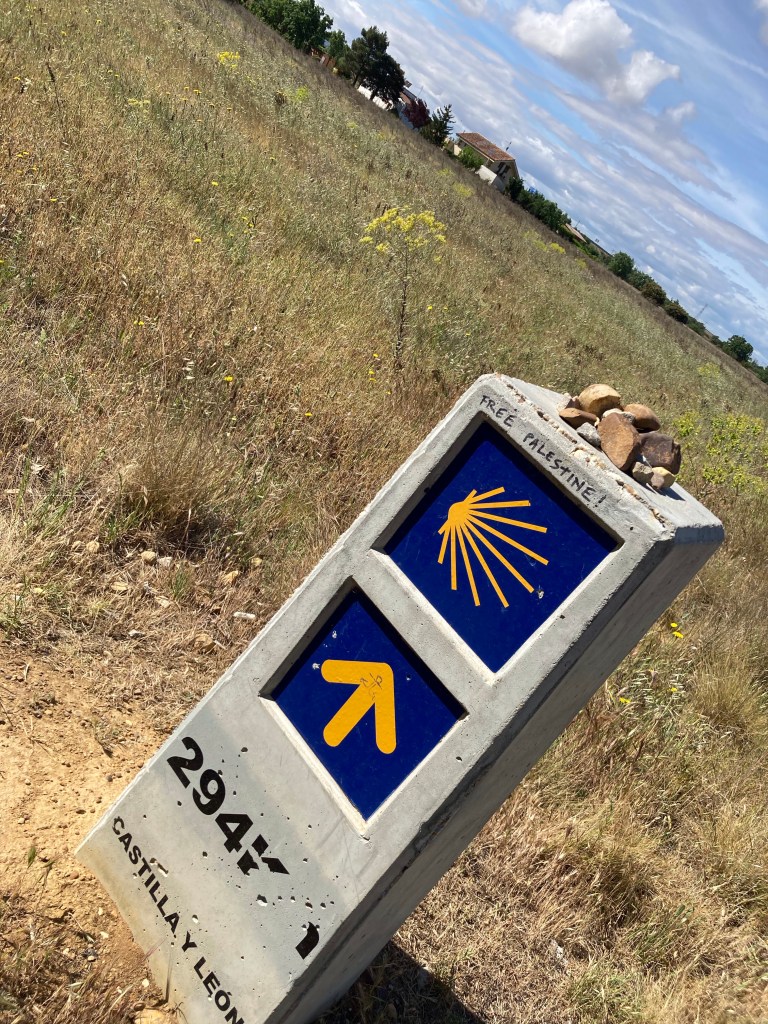 Dann am Platz „Plaza de San Marcos“ schwenken wir auf den Camino ein und haben die über allen und alles strahlende Morgensonne im Rücken.