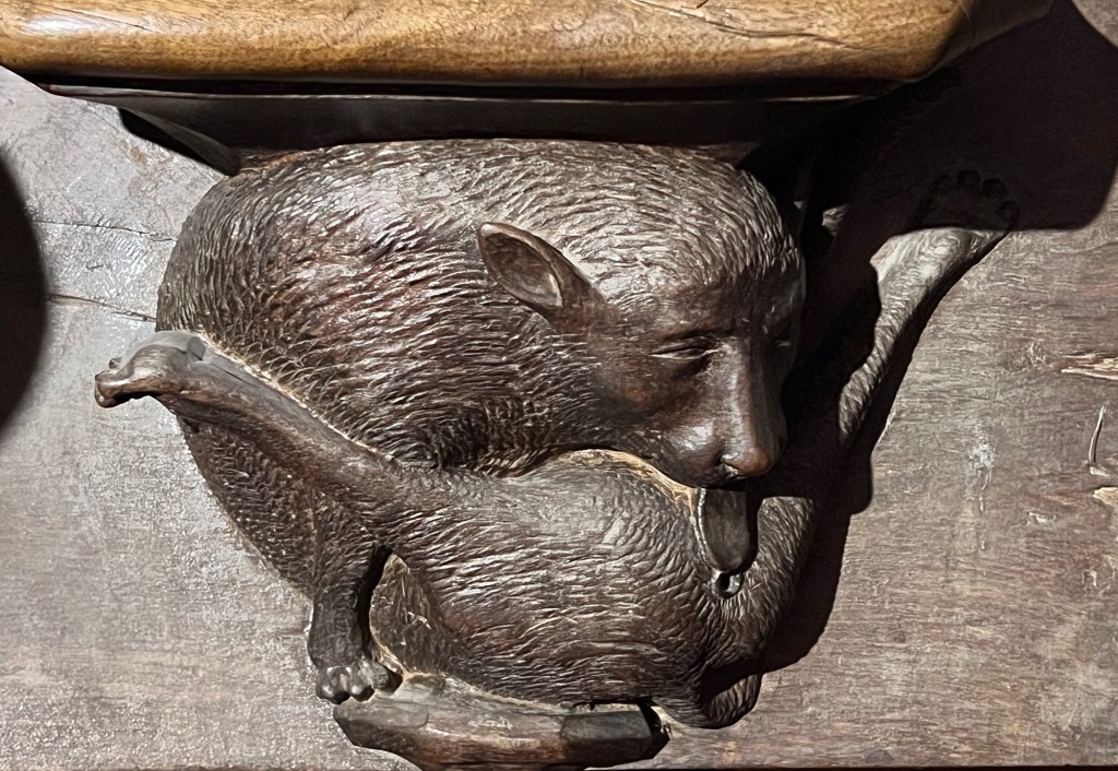 Apropos putzig. Ein Fantasietier, das mit gespreizten Beinen genüsslich am eigenen Hinterausgang leckt. Ein Betrunkener mit glasigen Blick über einem Weinfass. Ein Mann, der sich in Schräglage einen Krug mit der Linken an den Allerwertesten hält. Das sind Szenen, die man am allerwenigsten in Kirchen erwarten würde, doch in der Kathedrale von León gibt es sie. Genauer: Im spätgotischen Chorgestühl. Da muss man allerdings vorbereitet sein, auf befremdlichen Stoff im heiligen Hafen. Ein Künstlerteam aus Flandern schnitzte das Chorgestühl Ende des 15. Jahrhunderts aus Nussbaumholz. Die Schule dort war offenbar sehr fortschrittlich und die Institution Kirche viel offener, als man es heute für möglich hält. Natürlich finden sich im Chorgestühl auch heilige und biblische Figuren wie König David, aber gleichermaßen profane, satirische, spöttische, teils obszöne Darstellungen. Ein Katalog des Guten und des Bösen. Hoppla, da ist ein Wildschwein das eine Dudelsack spielt. Worauf das wohl eine Anspielung sein soll?