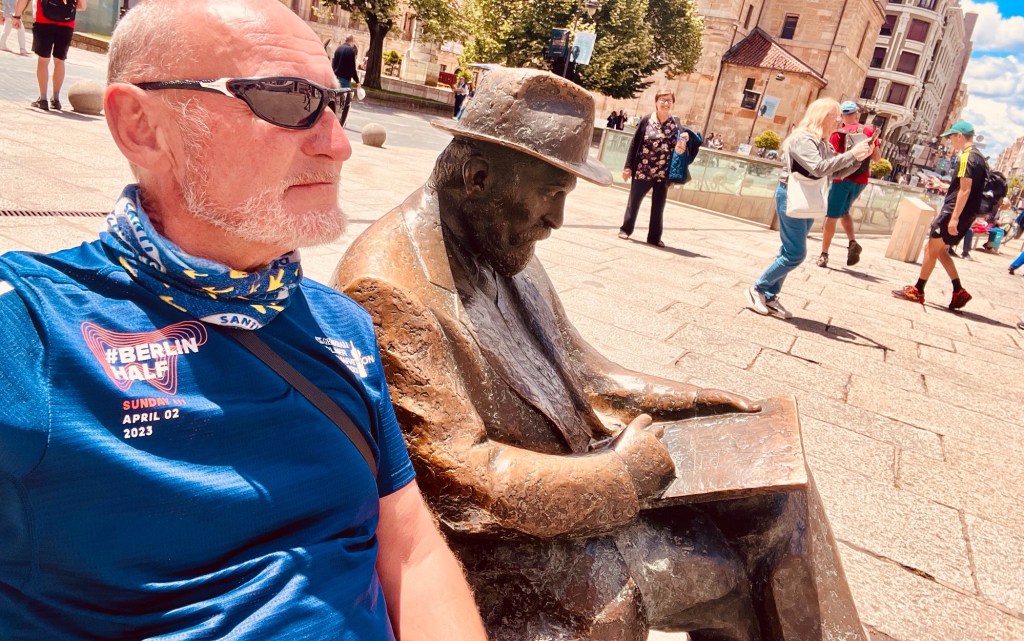 Hoppla, da finde ich doch an anderer Stelle der Stadt einen Blog-Genossen. Oder Block-Genossen? Allein sitzt er dort auf einer Bank, ein älterer Mann mit Hut. Er ist voll konzentriert bei der Arbeit, hat den Blick auf einen Skizzenblock in seinen Händen gesenkt. Das hier ist – in Bronze verewigt – das Jugendstilgenie, Antonie Gaudi, der Architekt der weltberühmten Sagrada Familia und anderer Bauten in Barcelona. Hier in Spaniens Norden hat er drei Werke hinterlassen. Die Sitzbank, auf der wir beide hier mal Platz genommen haben, ich der Blogschreiber, er der Blockzeichner steht gerade gegenüber der Casa Botins auf dem Plaza San Marcelo im Herzen von Leon. Na gut, wir wollen es mal nicht übertreiben. Ich schreibe einen kleinen Blog und wandere durch Spanien. Er schuf ganze Bauwerke und wurde von einer Straßenbahn der Linie 30 in Barcelona überfahren, wegen seiner Kleidung für einen Bettler gehalten und nicht umgehend gerettet. Da bleibe ich lieber ein kleiner, unbekannter Pilger. Unbekannt und unerkannt machen manchmal keinen Unterschied.